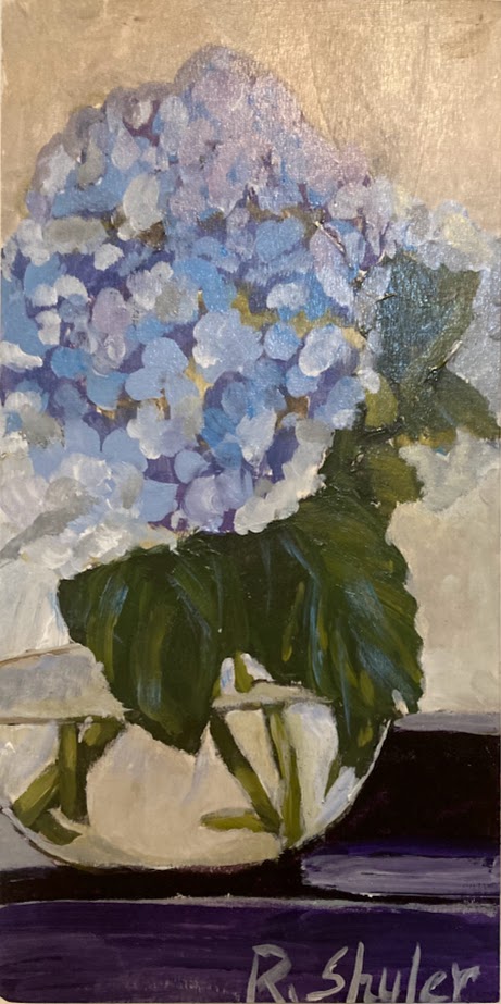 HAPPY DAY (6x12x1″ wood panel) Single Blue Hydrangea in Vase, $180 incl. sales tax and shipping (USA)