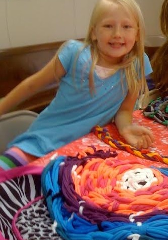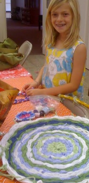One of the students warmed my heart by bringing all old t-shirts from her own closet and dresser drawers. Her rug was a beautiful lavender, blue, and green rug. Her design took all of her materials into consideration, and she used up most of her materials during class. She enjoyed the class and worked quietly without much help becoming quite the expert at weaving in the round.